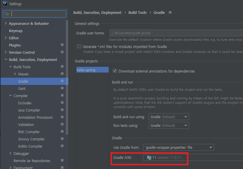 5. Build, Execution, Deployment > Build Tools > Gradle의 Gradle JVM 확인