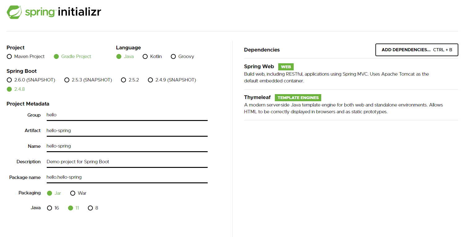 - Dependencies: Spring Web, Thymeleaf
